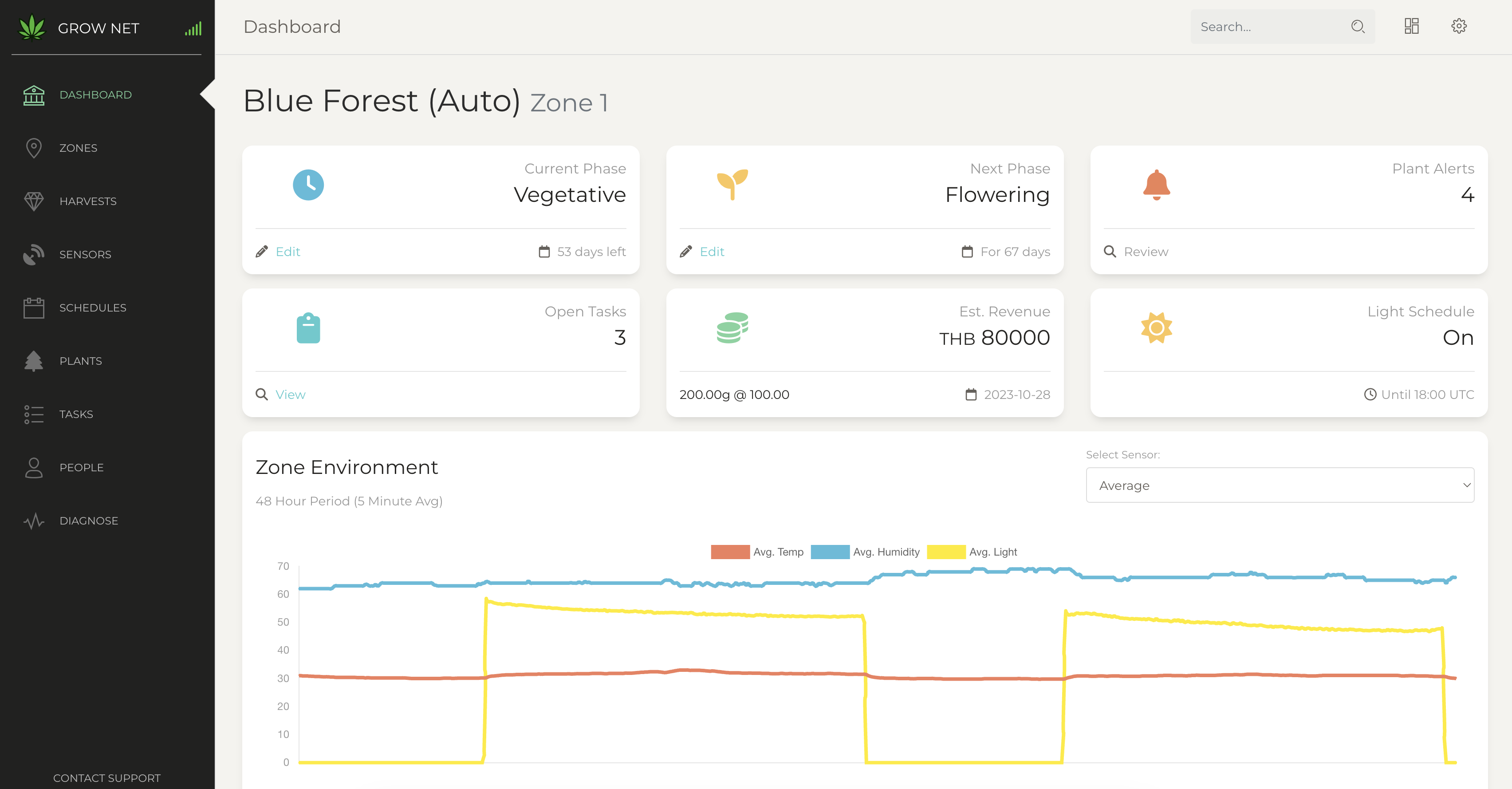 GrowNet allows you to experience hassle-free cultivation by seamlessly integrating schedules, monitoring and task automation, enabling you to focus on your business and enjoy repeatable high quality yields. GrowNet's flexible real-time monitoring and alerting design ensures that your farm scales with business demand.